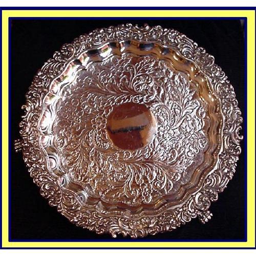 Very early salver made of Sheffield plate. England, circa 1800.<BR>Measures 10 1/4inches, excluding slightly protruding feet.<BR>Wonderfully executed salver with scalloped edge, bordered by an ornate ring of raised flowers, leaves and scrolls. The center is engraved with similair design. The middle is slightly raised to accomodate engraving a monogram. Stands on 3 beautiful paw feet. The back edge shows the fold of the silver over the copper very clearly. <BR>Like most early Sheffield silver, there are no marks. As is to be expected, there is some bleeding of the copper.<BR>No dings/dents/damage.