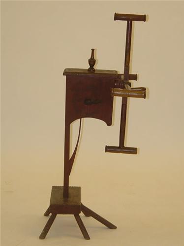 EARLY 19TH CENT. NEW ENGLAND YARN WINDER - MAPLE & PINE IN OLD BLACK &RED PAINT W/ WORKING COUNTER DEVICE, FINIALTOP, CHIP CARVED PLATFORM & 5 LEGS (41 1/2" T X 27" W X 19" D) - WEAR, IMPERFECTIONS