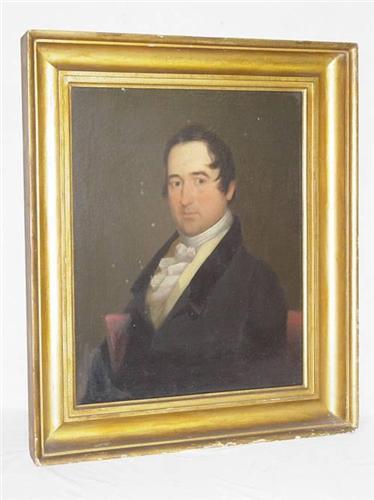 EARLY 19TH CENT. OIL ON CANVAS PORTRAIT OF EZEKIEL ROOT COLT (BORN 1794-1860; OF THE COLT RIFLE MANUFACTURING CO. FAMILY-PURCHASED IN 1970 AT COLT AUCTION (LABEL) ), UNSIGNED IN PERIOD GESSO FRAME - MINOR DAMAGE AND CRAQUELURE;