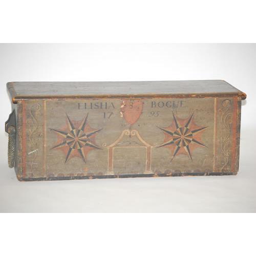 IMPORTANT EARLY 19TH CENT. SAILOR'S DECORATED SEA CHEST - 18TH cENT. NEW ENGLAND DOVETAILED 6-BOARD PINE CHEST W/ ORIGINAL PAINTED FOLK ART NAUTICAL DESIGNS-"ELISHA BOGUE" & DATED 1795 ON FRONT (ESSEX/NEW LONDON CT) W/ SAILOR'S HEART AROUND LOCK ESCUTCHEON W/ (2) LARGE COMPASS 8-POINT STARS & ARCH PAVILLION ON BOTTOM CENTER W/ TRAILING VINES DOWN EACH SIDE ON THE LEFT & RIGHT ON FRONT & A DEMILUNE DESIGN BOTTOM BORDER, ALL ON A WEATHERED GREEN PAINTED BACKROUND W/ BLACK PAINTED HANDLES & BRAIDED ROPE BECKETS-WRITTEN IN PENCIL ON TILL LID MADE NOV. 28TH 1794 (PROVENANCE: GLADYS WOOD ESTATE-NANTUCKET ISLAND MA) (17 1/2" T X 47 1/2" W X 17" D) - EXCELLENT SURFACE & OVERALL PAINT DECORATION, WEAR, REPLACEMENTS, REPAIRS, IMPERFECTIONS