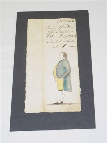 EARLY 19TH CENT. WATERCOLOR ON PAPER OF GENTLEMAN IN BLUE LONG COAT PAINTED ON INTEREST NOTE TO OFFICERS & SOLDIERS - TONING;