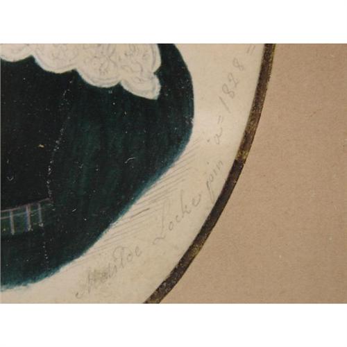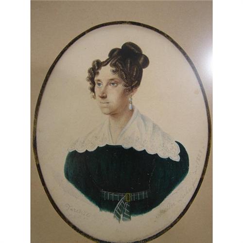 EARLY 19TH CENTURY WATERCOLOR PAINTING. Depicts a female wearing a green dress. Signed at bottom left “Frenle” and at bottom right “Matilde Locke pin a = 1828 =”. Framed and matted. Frame: 9” x 7.5”.