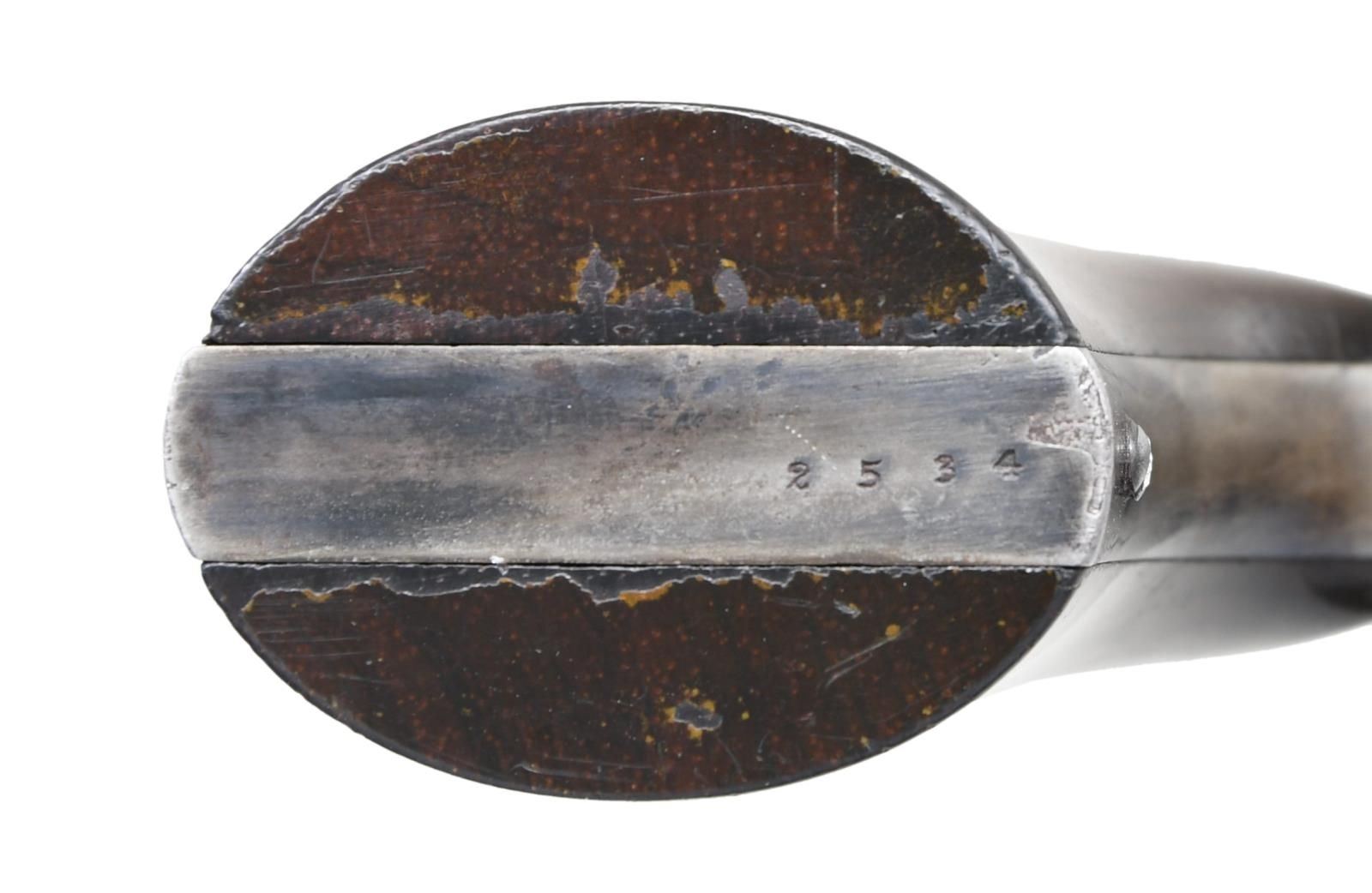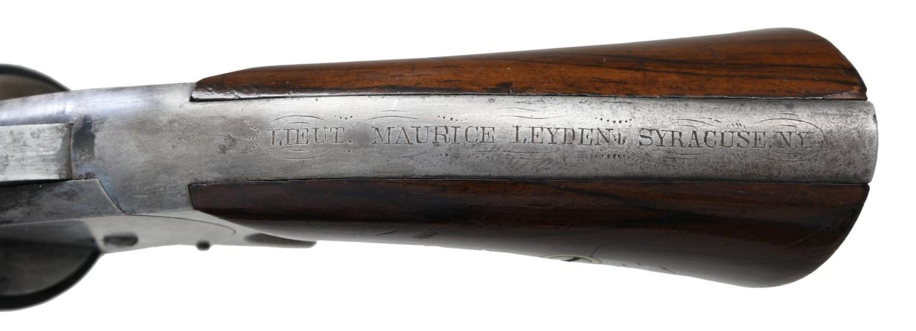 ARMY REVOLVER, LT. MAURICE LEYDEN, 3RD NEW YORK VOLUNTEER CAVALRY. Cal. 32, S# 2534. Standard configuration of Civil War Smith & Wesson army revolver, 5" barrel, blue finish, rosewood grips. Revolver was made early 1862, probably January according to Mr. Bricker's notes and research. Inscription on backstrap "LIEUT. MAURICE LEYDEN, SYRACUSE N.Y.". Maurice Leyden (1836-1906) enlisted in Syracuse NY January 13, 1861 into Co. B, 3rd NY Cavalry as 2nd lieutenant. The 25 year old recruit was a dentist before the war. He was captured October 7, 1864 on Darbytown Road near Richmond, and was held as prisoner of war at Libby prison, and later moved to prison in Salisbury. He was exchanged April 1st 1865, and promoted to captain in NY 1st Mounted Rifles. He remained in Richmond occupation and was mustered out November 29, 1865. Maurice Leyden kept diaries and wrote many letters during his life which can be found scattered around the country, but the bulk is housed at Binghamton University. One interesting letter is found online at the Library of Virginia where he is writing to his wife in the trenches at Petersburg in 1864. UNATTACHED ACCESSORIES: file of research including notes when purchased, service records and pension records of Maurice Leyden. CONDITION: very good overall, traces of original blue finish in protected areas, markings good including inscription on backstrap. Mechanically fine, bright shiny rifled bore. PROVENANCE: purchased from Hamburg New York dealer/collector Frank Panasuk May 22, 1993 at the Ohio Gun Collectors Association show; from the Lifelong Collection of Robert "Mike" Bricker. (01-24995/JS). ANTIQUE. $2,000-3,000.