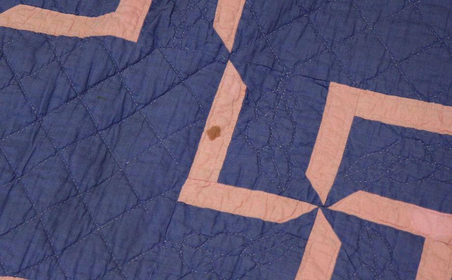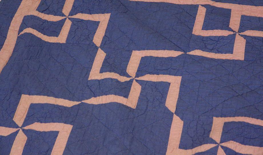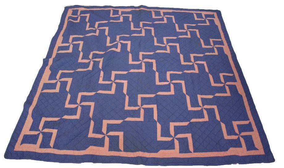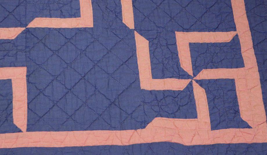 66x76 inches. Hand sewn cotton quilt with interlocking good luck swastika designs in blue and pink with white backing.
