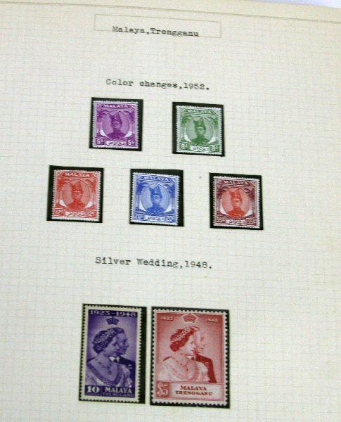 Stamps are all postal issue unhinged and unissued. Stamps included are all before 1950s. Commonwealth locations represented and page quantities for each include: Malaya (11), Malta (4), Mauritius (4), Morocco (3), Montserrat (5), New Zealand (4), Papua (1