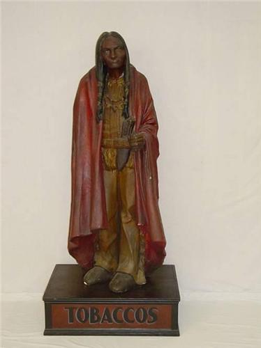 EARLY 20TH CENT. 61" CIGAR STORE INDIAN-PAINTED PAPIER MACHE W/ GREAT OLD PATINA ON A 9 1/2" H X 32 1/2" W PAINTED PLINTH "TOBACCOS" - MINOR IMPERFECTIONS & PAINT LOSS TO INDIAN, OVERALL VERY GOOD;