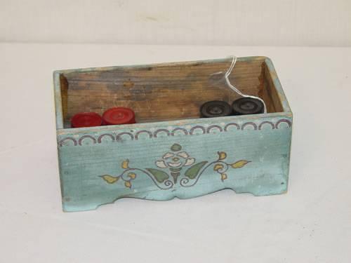 EARLY 20TH CENT. PAINTED GAME PC. BOX W/ CHECKERS IN BLUE PAINT & STENCILED FLOWER DECORATION - PAINT LOSSES & LOOSE CONSTRUCTION;