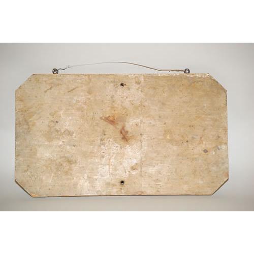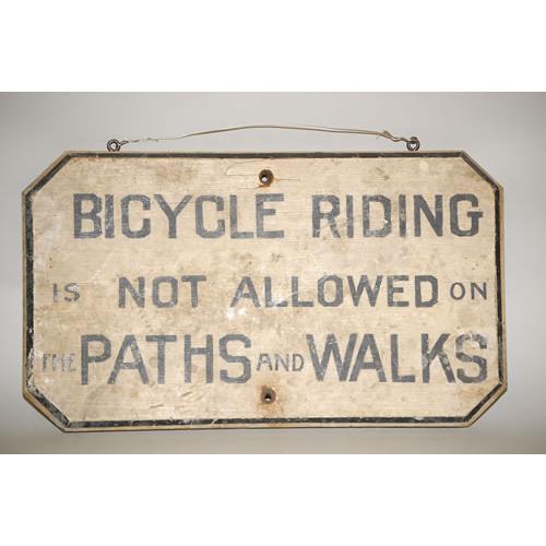 EARLY 20TH CENT. PAINTED PUBLIC SIGN - BLACK & WHITE PAINTED MUNICIPAL PUBLIC SIGN ON A BEVELED PINE BOARD- "BICYCLE RIDING IS NOT ALLOWED ON THE PATHS & WALKS" (8" X 14") - DRILLED FOR MOUNTING, WEAR, SOILING, IMPERFECTIONS