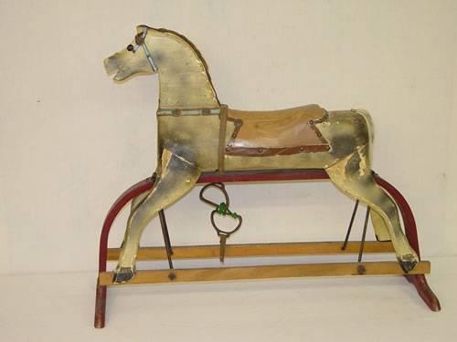 EARLY 20TH CENT. PAINTED ROCKING HORSE ON GLIDER BASE W/ LEATHER SADDLE BY WHITNEY REED LEOMINSTER MA - LOSSES TO PAINT, MANE & LEATHER;