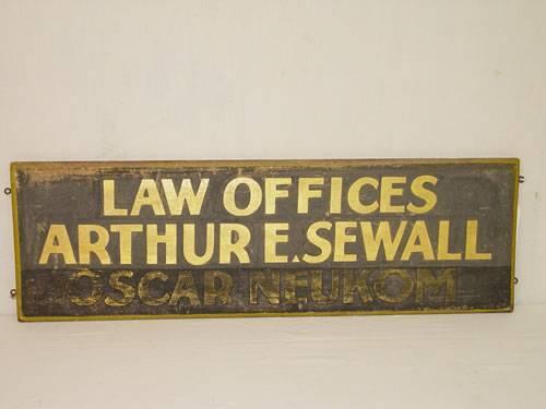 EARLY 20TH CENT. PAINTED TRADE SIGN "LAW OFFICES ARTHUR E. SEWALL-OSCAR NEUKUM" W/ SANDED FINISH - PAINT LOSSES & WEAR;