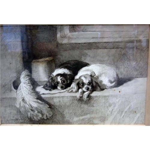 EARLY 20TH CENTURY ETECHING OF DOGS in oak frame sight: 8"x12" artist: Gilian Rolinger?