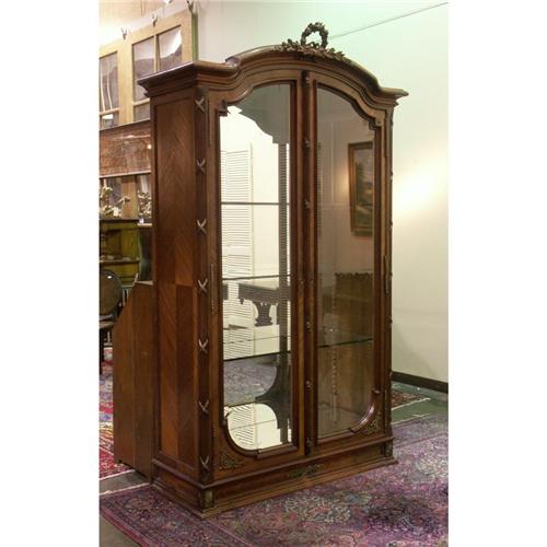 ARMOIRE: Early 20th century French Empire mahogany armoire, ormolu mounts, shelves, lighted display. 95''h x 19''d x 50''w