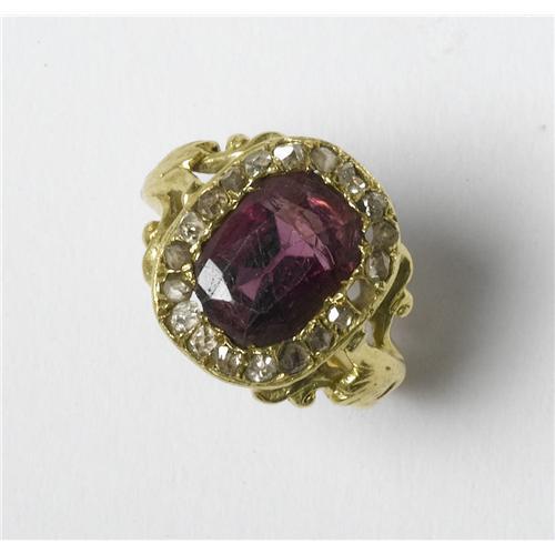 <B>EARLY 20TH CENTURY GARNET, DIAMOND, GOLD RING</B></I><BR><BR>The ring features a cushion-shaped rhodolite garnet measuring 10.00 x 7.00 x 3.88 mm, framed by rose-cut diamonds, set in 18k yellow gold with elegantly scalloped shoulders. Gross weight 4.40 grams. Finger size 5. Note: ring is sizable.<BR><BR> <B>Condition Report:</B> Good condition, missing one diamond, garnet has eye-visible inclusions, base of shank is thin.<BR><BR><b>Shipping:</b> Miscellaneous Collectibles, Smal (<a target="_blank" href="http://www.heritageauctions.com/common/shipping.php">view shipping information</a>)