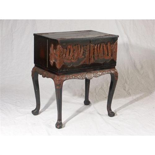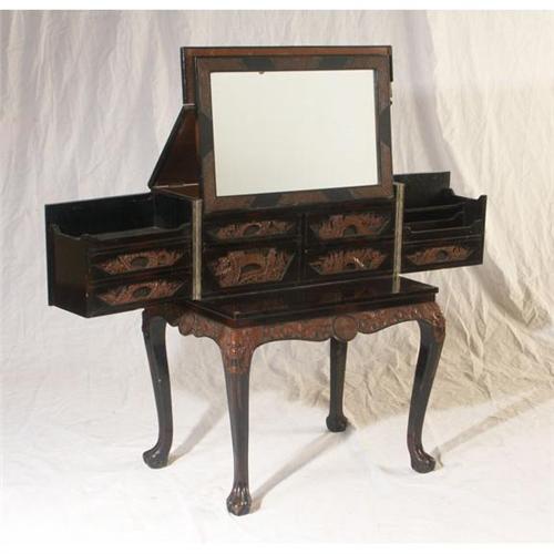 VANITY AND BENCH: Early 20th century Italian Chinese inspired vanity and bench, black lacquer with cinnabar color relief carving; cabriole legs with claw feet; pull up top with mirror, sides swing out to reveal multiple drawers. 35''h x 19''d x 30''w