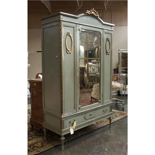 ARMOIRE: Early 20th century French Louis XVI style armoire, painted light green with gold accents, carved crest and corner pilasters, large beveled mirror center door. note: paint loss and flaking. 93''h x 21''d x 52''w