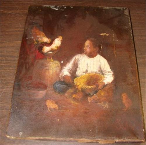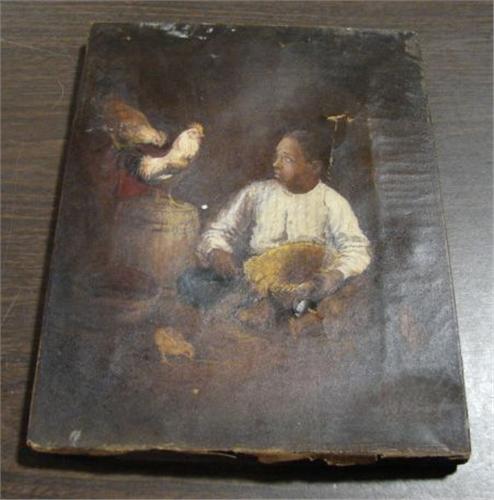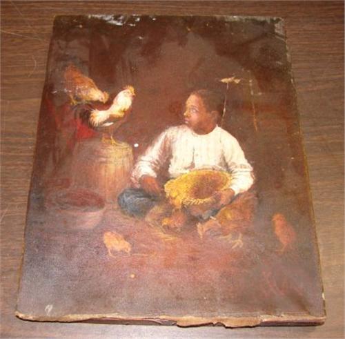 EARLY 20TH CENTURY OIL ON CANVAS PAINTING. Depicts an African-American boy sitting next to some biddies and a rooster. Painting shows some tearing and is in need of restoration. Unsigned. 10.25" x 13.25" unframed