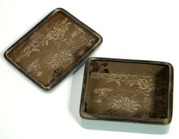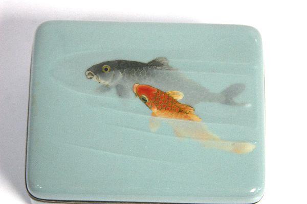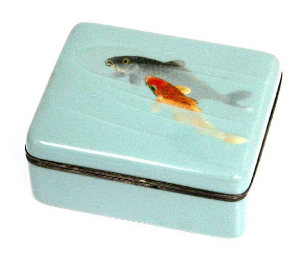 Japanese. Early 20th century. Moriage (wireless) work, pair of carp on a pale turquoise ground, (raised lines), 5 x 4 inches.