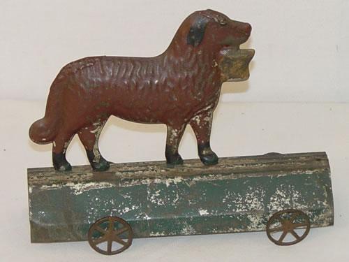 EARLY 7" PAINTED TIN SAINT BERNARD W/ CASK PULL TOY (PROBABLY GEO. BROWN) - PAINT LOSSES & WEAR