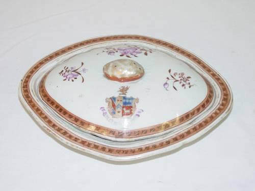 EARLY 9" ORIENTAL EXPORT COVERED VEGETABLE W/ CREST & FLORAL DECORATION - PAINT WEAR;