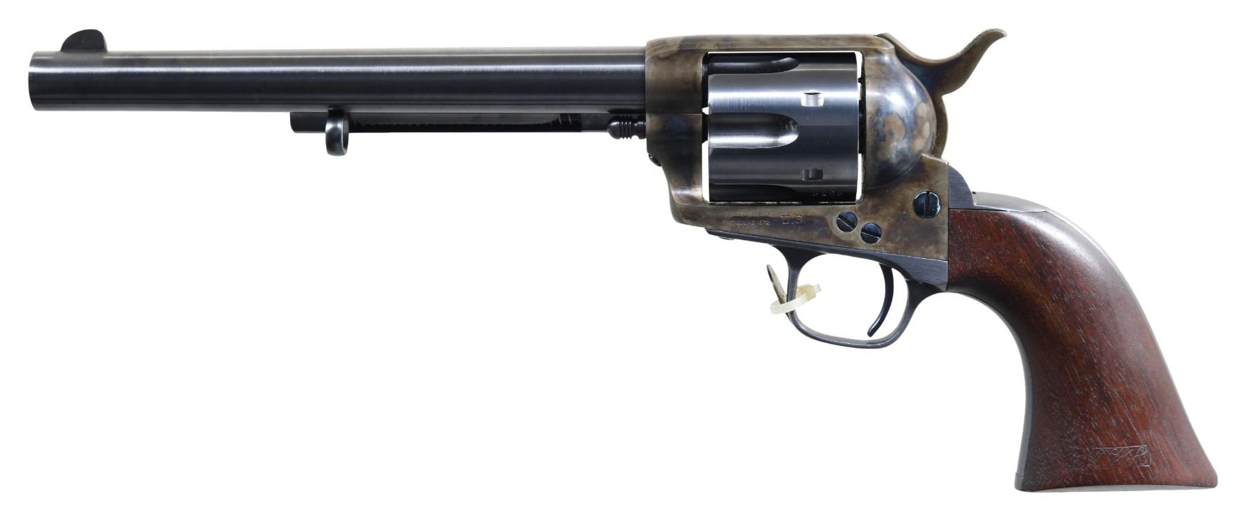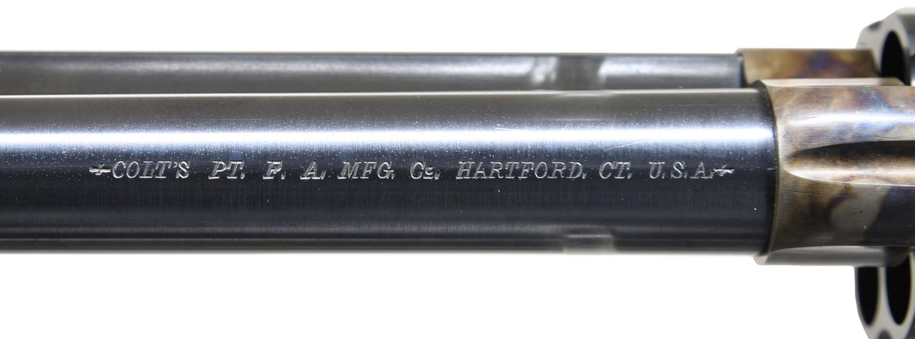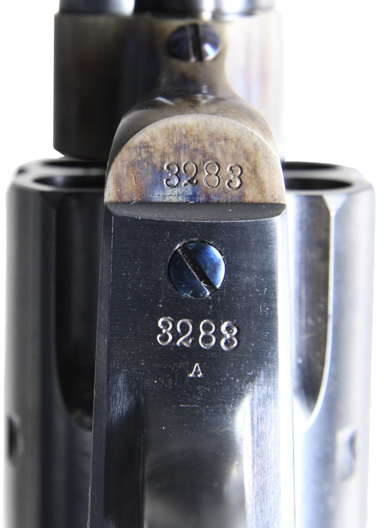 Cal. 45. S# 3283. This revolver was manufactured in 1874 is in the standard configuration of cavalry issued revolvers of the Indian War era, 7.5" barrel with 1-line slanted Hartford address with daggers. Frame is stamped along with two line patent dates with small "U.S.". Small "A" inspection marks found on barrel, trigger guard, back strap, cylinder, and bottom of grips. "OWA" cartouche on left grip. UNATTACHED ACCESSORIES: collector's tag stating bought at Vegas show $38,000, 95% finish. CONDITION: excellent as refinished, retains virtually all of its blue and case-color finish, markings all fine, grips also excellent with good cartouche. Mechanics fine, bright shiny rifled bore. (01-26760/JS). ANTIQUE. $4,000-8,000.
