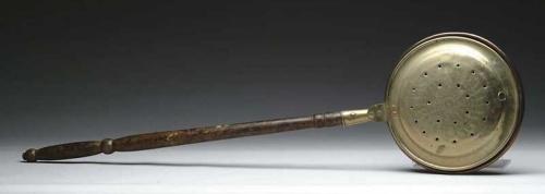 EARLY AMERICAN BRASS AND COPPER WARMING PAN. Brass lid with chase decoration in sun motif. Pierced hinged cover with original grain painted handle. First quarter of the 19th Century of Maine origin. SIZE: 46-1/2” l; 12-3/4” pan dia. CONDITION: Very good. 9-26821