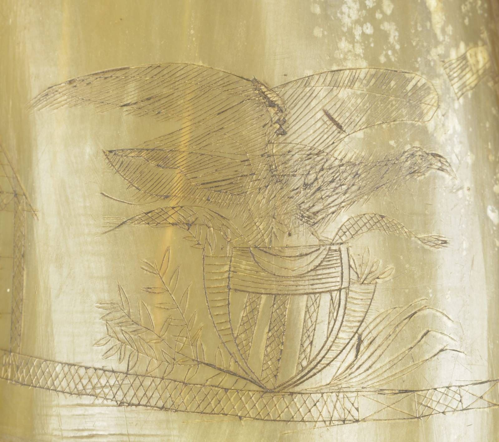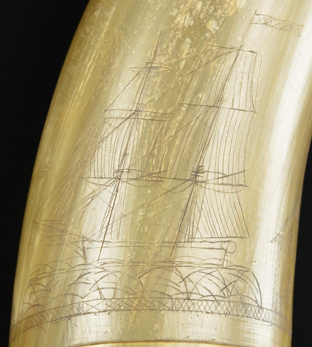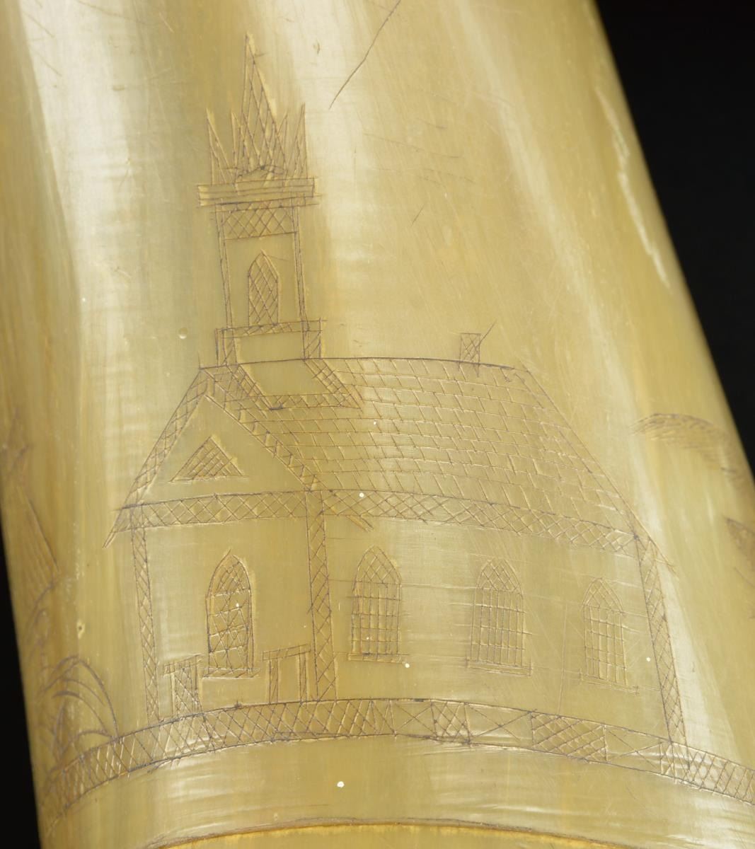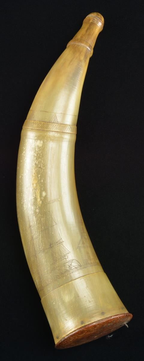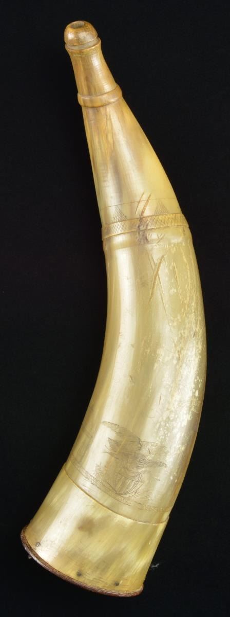 MORE. Overall length: 13". A fine early powder horn decoratively carved with a 2 masted sailing ship, a church, an American eagle on shield, and what appears to be a lighthouse flying American flags. The butt has a turned, incised line and a flat pegged cap with a small iron loop. The spout has 3 decorative turnings. CONDITION: there are visible wear spots concentrated on one side. The engraving is sharp, clear and easily discernible. No noticeable cracks or significant damage. (02-17713/BF). $300-500.