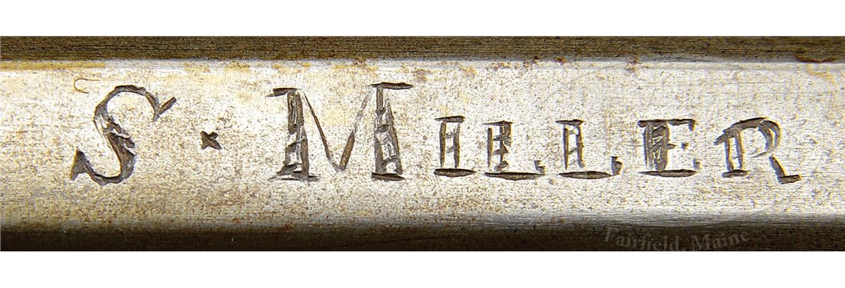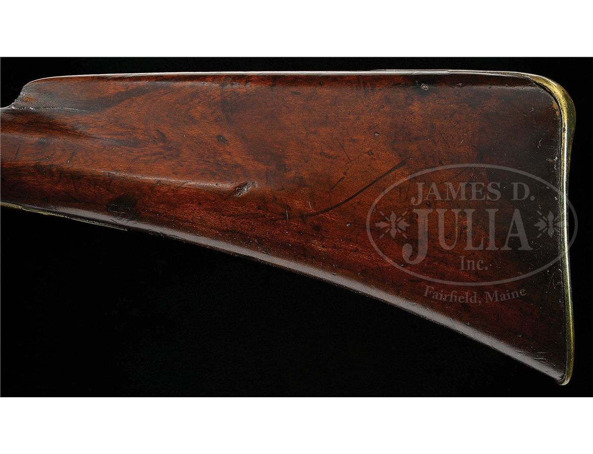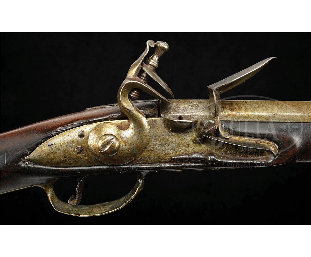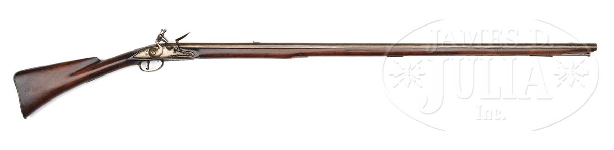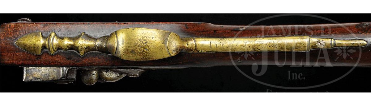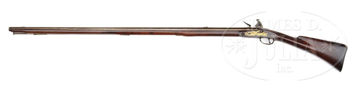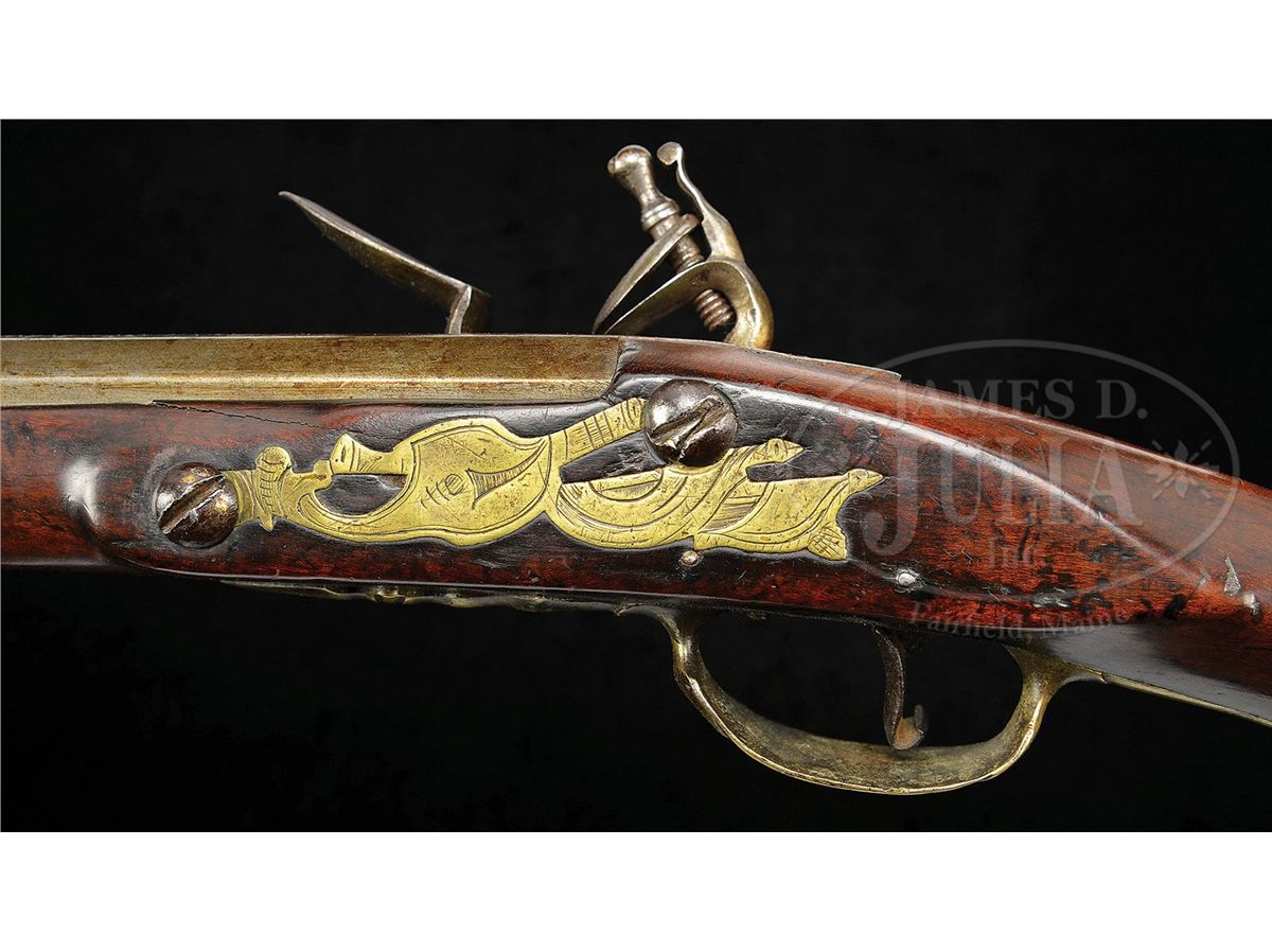 NSN. 42" oct to rnd .52 Cal bbl engraved "S MILLER". This English style fusil is walnut stocked and has typical early English style brass furniture. Bbl is pinned to stock and ramrod is held in place by three early heavy ramrod pipes. Early flintlock appears to be orig flint and is unmarked. Brass sideplate is very intricate with flag designs and one piercing. This fusil is attributed to the gunsmith Simon Miller listed in Sellers American Gunsmiths from 1775-1806. PROVENANCE: See American Gunmakers, 1953, by Gluckman, p. 143. Collection of Dr. Douglas Sirkin. CONDITION: 17" of forend wood is replaced at muzzle. Flint lock needs adjustment. 4-49973 RG117