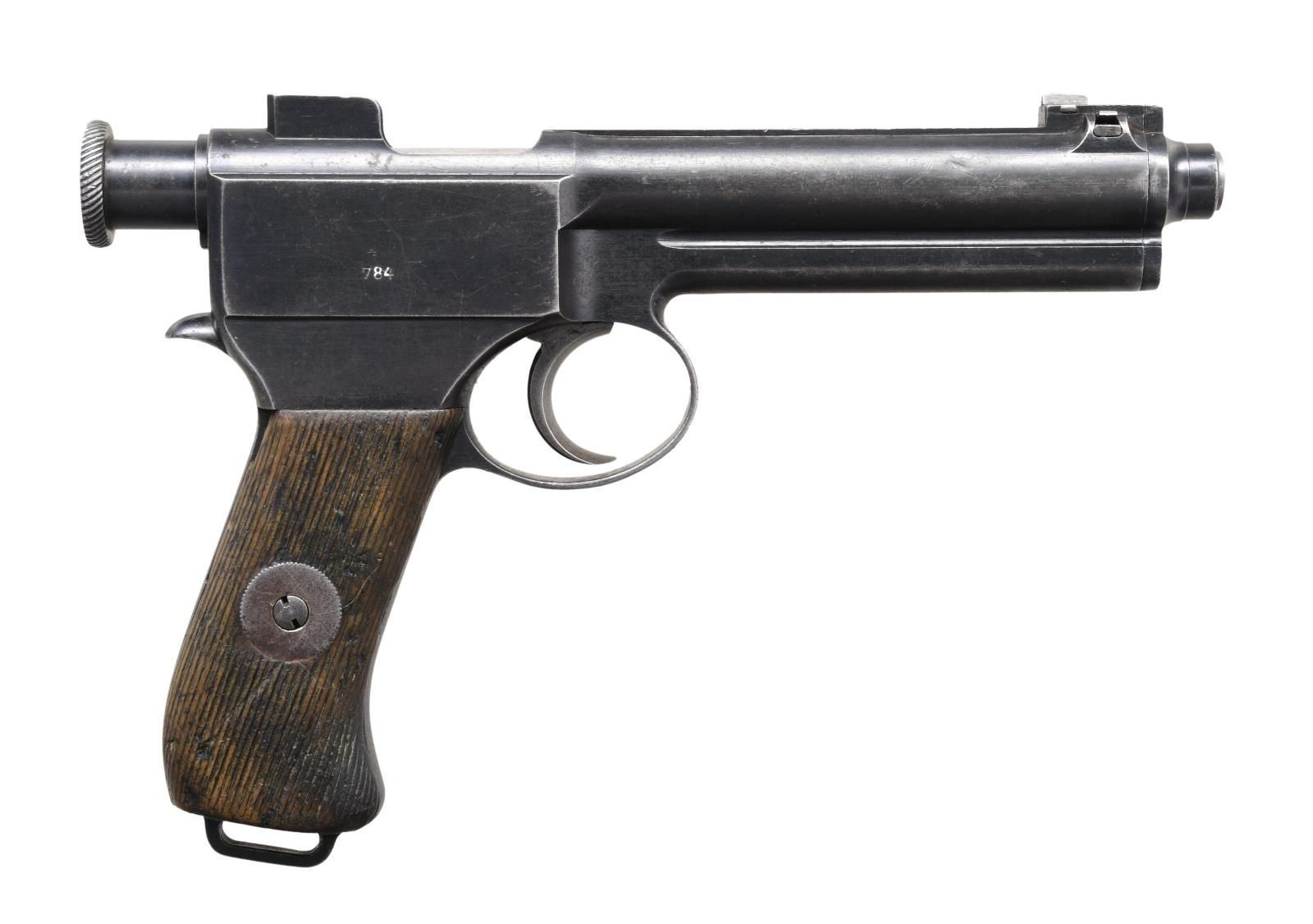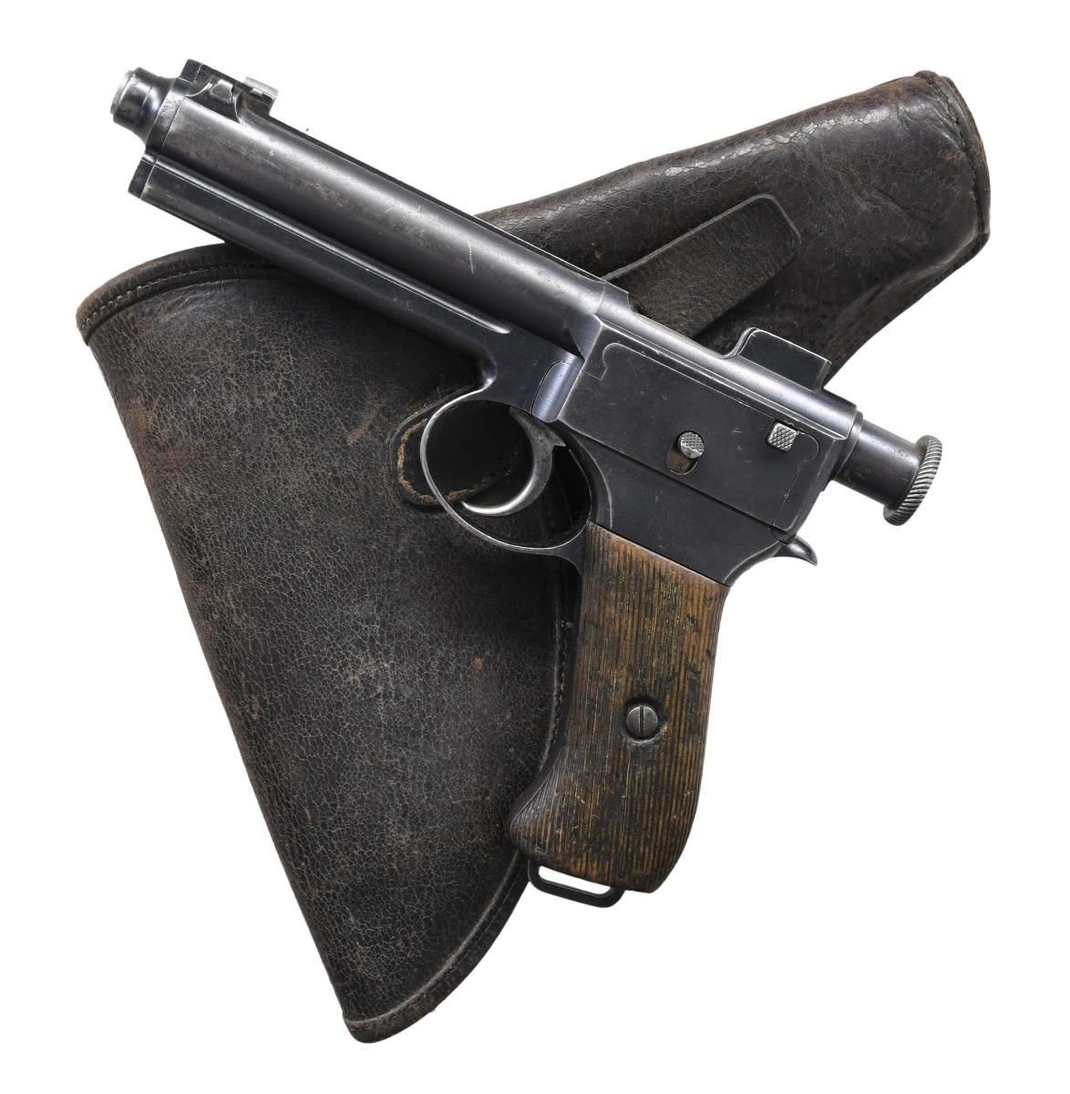 Cal. 8mm Steyr. S# 784. Bbl. 5". Blade front sight. V-notch rear sight. Early model w/o disconnector. Rear of the frame has an Austrian eagle "Wn 9" acceptance stamp denoting 1909 KUK acceptance. Blued finish. Grooved hardwood grips with an unmarked disc on the right side. UNATTACHED ACCESSORIES: black leather Austrian holster that has belt loops. Holster shows overall crazing and some crackling. CONDITION: grips display a loose fit with a couple chips, scattered dings, and handling wear. Extractor retains most of its strawed finish with some oxidation. Other strawed parts are mostly faded to gray with some oxidation. The balance of metal retains 40% of its original blue with overall fading, a few dings, and some oxidation. Very good, bright bore. PROVENANCE: the collection of Curtis H. Halvorson. (23-5886/MJC). CURIO. $1,000-1,500.