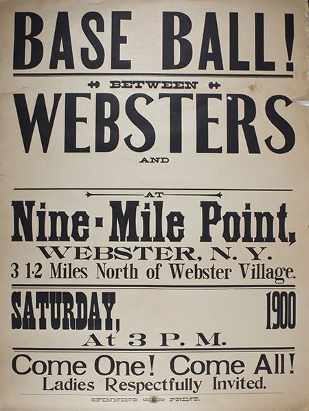 A fine poster advertising a forthcoming baseball game between the "Websters" and another yet undisclosed team at Nine Mile Poin in Webster, N.Y., on Saturday ?, 1900. The poster has blank areas to fill in the details and courteously adds "Ladies Respectively Invited" at bottom. Measures 20" x 28" and printed on thin paper. Chipping to edges, a 2" tear to top left edge affecting nothing, one small hole at center, still overall very good condition, worthy of restoration.