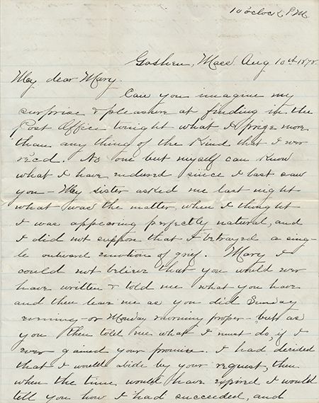 Lot of two items related to early baseball includes: Good content baseball player's letter, 6pp. 4to., Goshen, Ma., Aug. 10, 1876 in which "Howard" writes his girlfriend. Heartbroken Howard is greatly upset learning that Mary will be away for five months, and his emotions take up most of the letter. He does conclude: "...We have been to Worthington today, and we won an easy victory, 37 to 13...My record - 3rd at bat - 1st in number of runs, 3 assist, put out 6 men, altogether a very disgusting game, as we were very unevenly mismatched...". Sold with: Newspaper, Paterson Daily Press, 4pp. folio, Aug. 14, 1866 with a brief stories on p. 3: "Base Ball. - A match game of base ball was played...between the Mystics and Atlantics of this city...a well earned victory for the Mystics, by a score of 46 to 31...Olympics vs. Irvingtons...circles are on the qui vive to see the match tomorrow...". Very good.