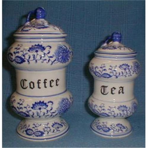 Being offered are a BLUE ONION pattern COFFEE and a TEA cannister. The coffee is 8 3/4" tall and the tea is 7 1/4" tall, they are marked on the bottom underglaze in blue with crossed arrows and "BROWN ONION". Both of these pieces are in perfect condition, no chips, cracks, breaks or repairs and I believe they date from the early 1900's.