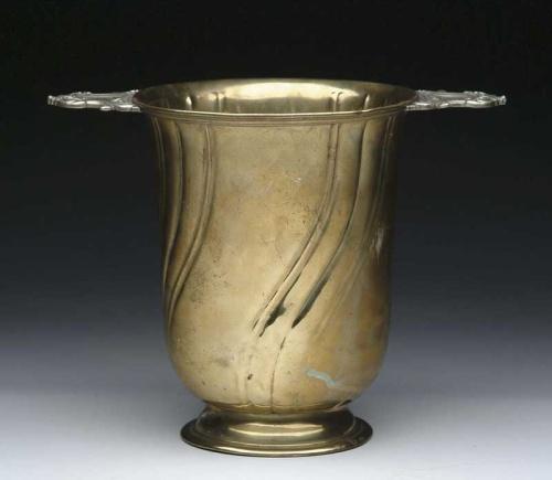 EARLY BRASS AND SILVER PLATE WINE BUCKET.  French bucket has swirl motif on a footed base with silver plated scroll and leaf decorated handles.  18th/19th Century.  SIZE:  8-3/4” h x 7” dia (without handles).  CONDITION:  Very good.  9-27097