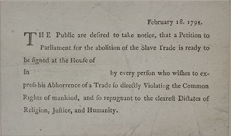 An very rare, early printed broadside measuring 5 1/2" x 3 1/2" [sight], Feb. 18, 1792, reading, in full: "The Public is desired to take notice, that a Petition to Parliament for the abolition of the Slave Trade is ready to be signed in the House of [blank] in [blank] by every person who wishes to express his Abhorrence of a Trade so directly Violating the Common Rights of mankind, and so repugnant to the Clearest Dictates of Religion, Justice, and Humanity". According to literature from the Schomburg Center for Research in Black Culture, "There was always an international dimension to the early abolitionist movement; indeed, foreign support and intervention were deemed vital to the success of the movement at home. In pursuit of these aims, British abolitionists made contact with the French Société des Amis des Noirs, following its organization in 1788". This organization resulted in the creation of the 1792 Petition to which our broadside refers, presented to the House of Commons. The House voted by a landslide for a gradual abolishment of the slave trade to be fixed on Jan. 1, 1796. Matted and framed, in very good condition. Not examined out of frame.
