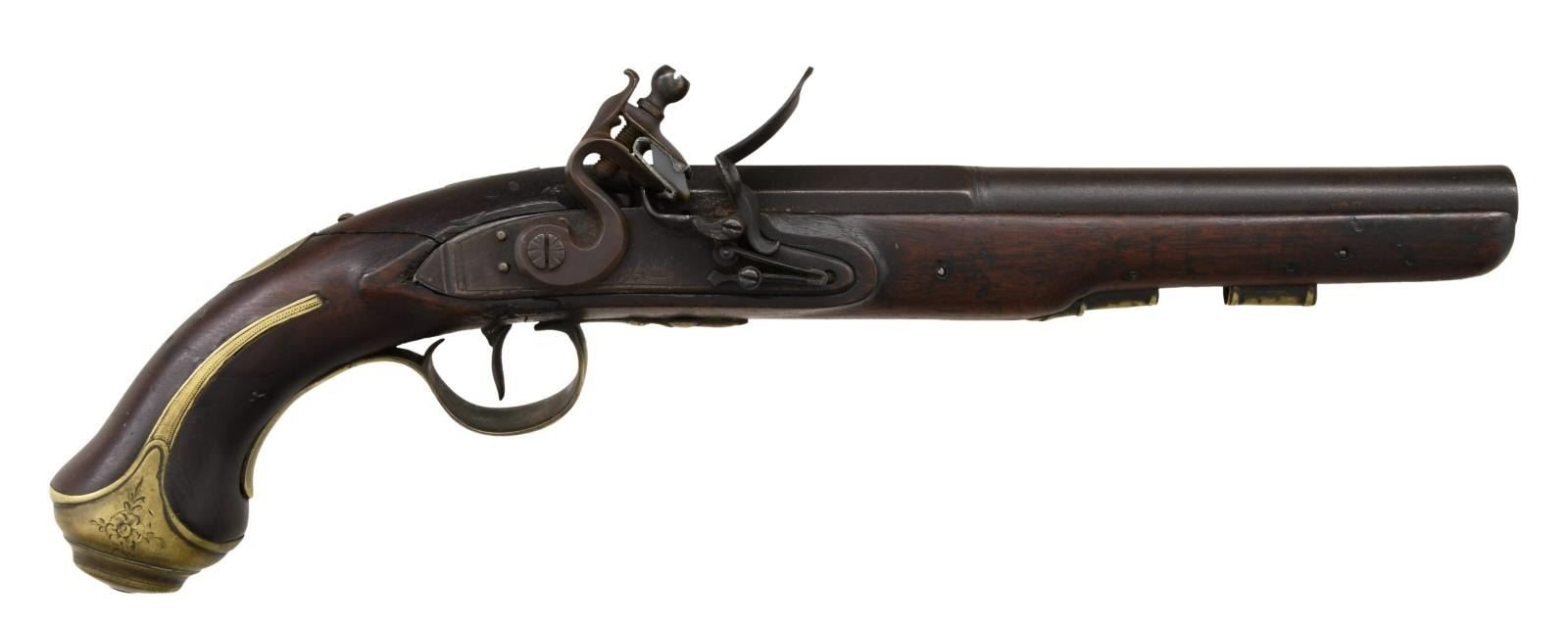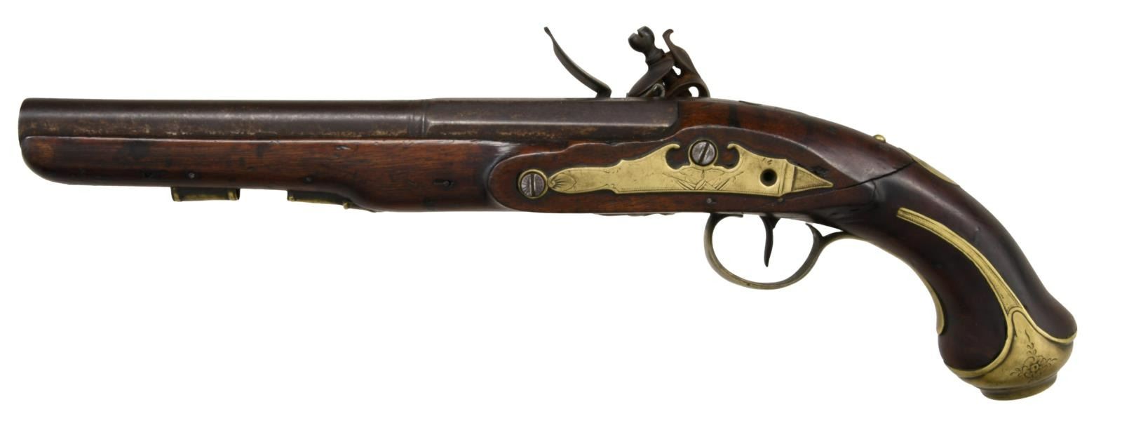 Cal. 65. NSN. Bbl. 9". This pistol likely dates from the very late 18th century or early 19th century. The octagon to round barrel has 3 small proofs on the top facet near the breech. The barrel tang has engraved decoration, as does the tang screw. The lock is marked under the pan "Gill". Brass trigger guard with acorn finial and flower engraved at the bottom of the trigger loop. Brass buttcap with long ears and similar engraved floral decoration on either side. Brass side plate with engraved foliate decoration along with a spray of arms. The side plate is drilled for the attachment of a belt hook indicating Naval use, but the hook is missing. Brass ramrod thimble, entry thimble, and oval wrist escutcheon. No ramrod. CONDITION: barrel has a very dark patina, as does the lock. The markings on the lock are light but still discernable. The lock holds one cocking position and will fire from that position. Brass has a deep, mellow, mustard patina. Stock is broken at the wrist and repaired with a brass screw. Fair bore. (01-24093/BF). ANTIQUE. $600-900.