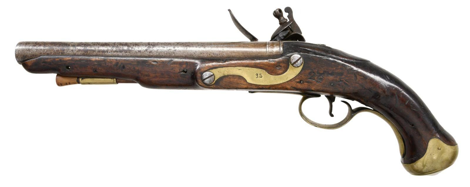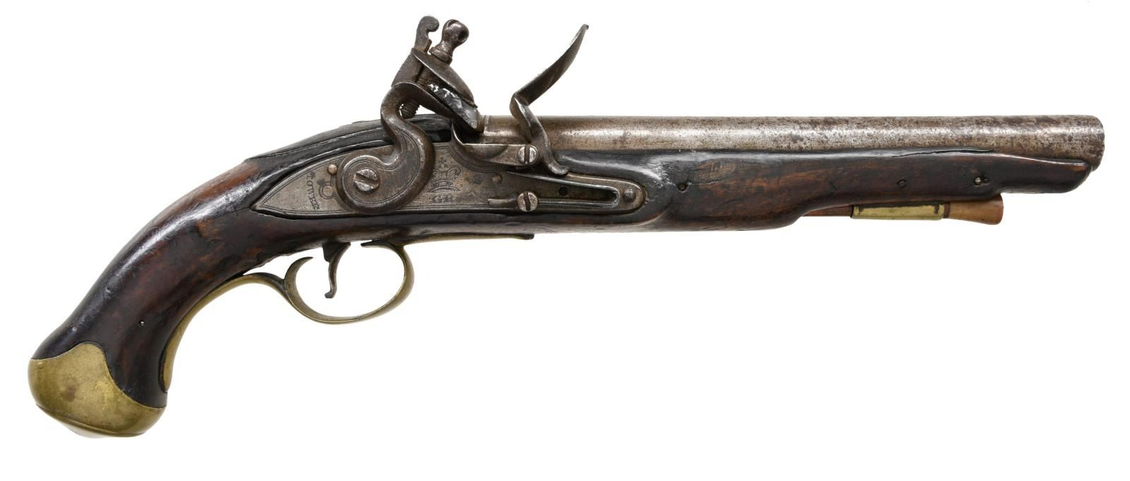 Cal. 69. NSN. Bbl. 9 3/16". This pistol dates from the late 18th to the very early 19th century. The round barrel has 2 proofs on the top, including a crowned "GR". The lock is marked with a crowned "GR" under the cock and "TOWER" behind the cock. There is also a small crowned broad arrow beneath the pan. Brass trigger guard, buttcap, side plate stamped "SL", ramrod thimble, nose cap. The stock is stamped "23" behind the side plate and is carved with a simple lobed design at the barrel tang. Short ramrod. CONDITION: barrel has a dark gray, mottled patina. The lock has an overall dark patina and holds both full & half cock. Brass has a mellow, mustard patina. Stock has numerous small dents & dings, attributing to its long service in the field. There may be a repair to the stock above the front of the lock plate. Ramrod may have been broken. Fair bore. (01-24088/BF). ANTIQUE. $1,200-1,800.