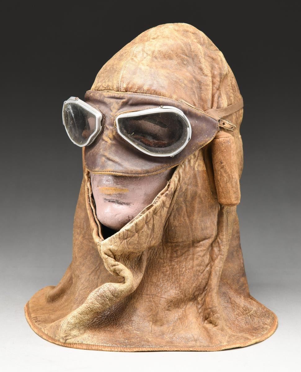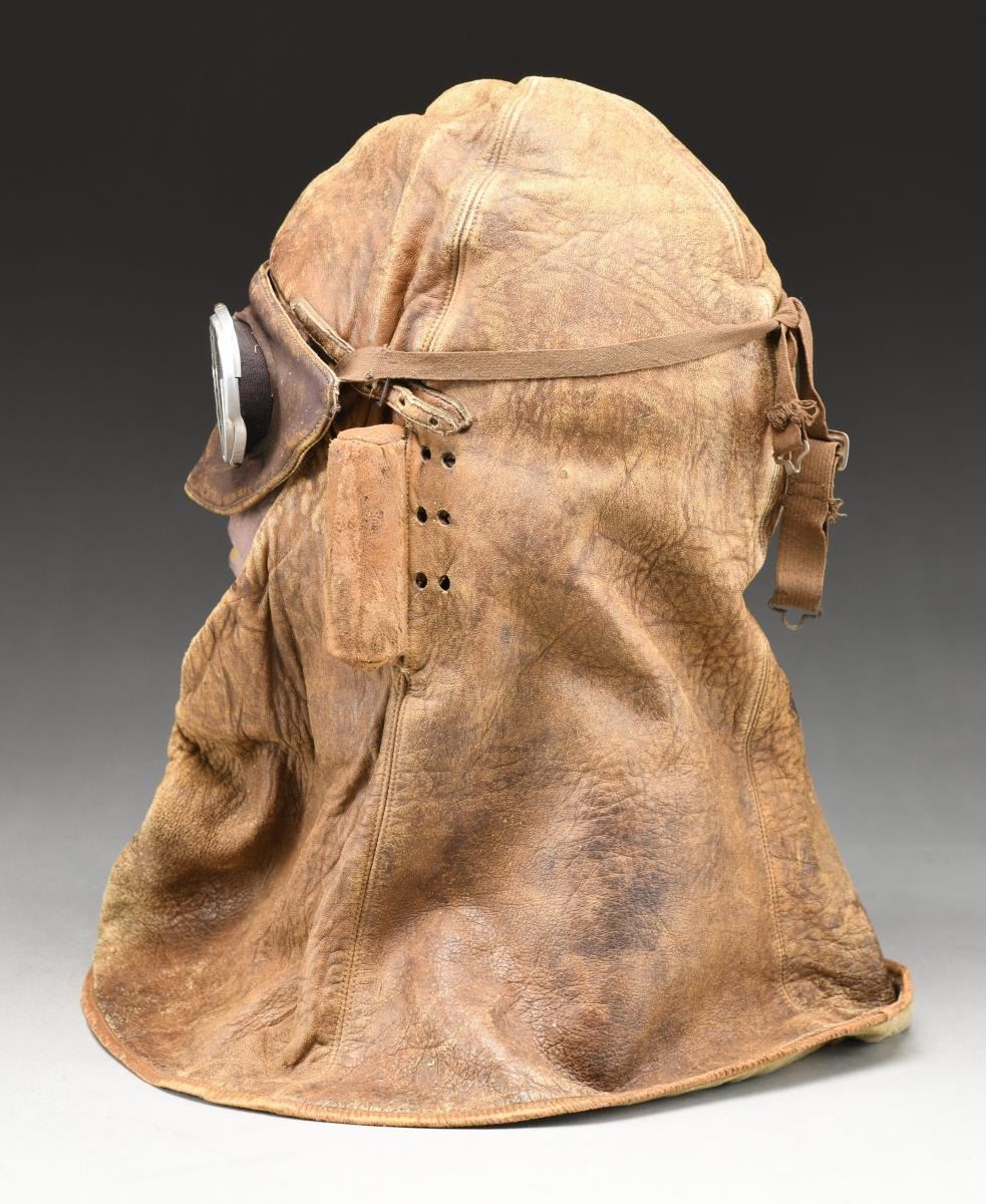 A rare, seldom seen private purchase early WWI British flight helmet in a soft brown leather that appears to be goat skin. There are 2 cylindrical appendages on each side of the face likely to support the goggles. There are also 2 adjustment straps with buckles in the brow area. The interior appears to be lined in white goat skin and has a label attached to the interior crown. The label is worn but appears to read "EXTRA QUALITY MADE BY A.EDMUND & CO LONDON". The goggles are brown leather with a white brushed cotton lining & brown wool around the eyes. There is an elastic band for securing the goggles. The eye pieces are glass with an aluminum border. CONDITION: the outside of the flight helmet shows wear but is quite solid with no damage or tears. The interior is reasonably solid but does have areas of insect damage. The goggles also show light to moderate wear. The spring in the elastic band is nearly gone. The right lens of the goggles shows cracks on the right side. (02-19857/BF). $1,000-1,400.