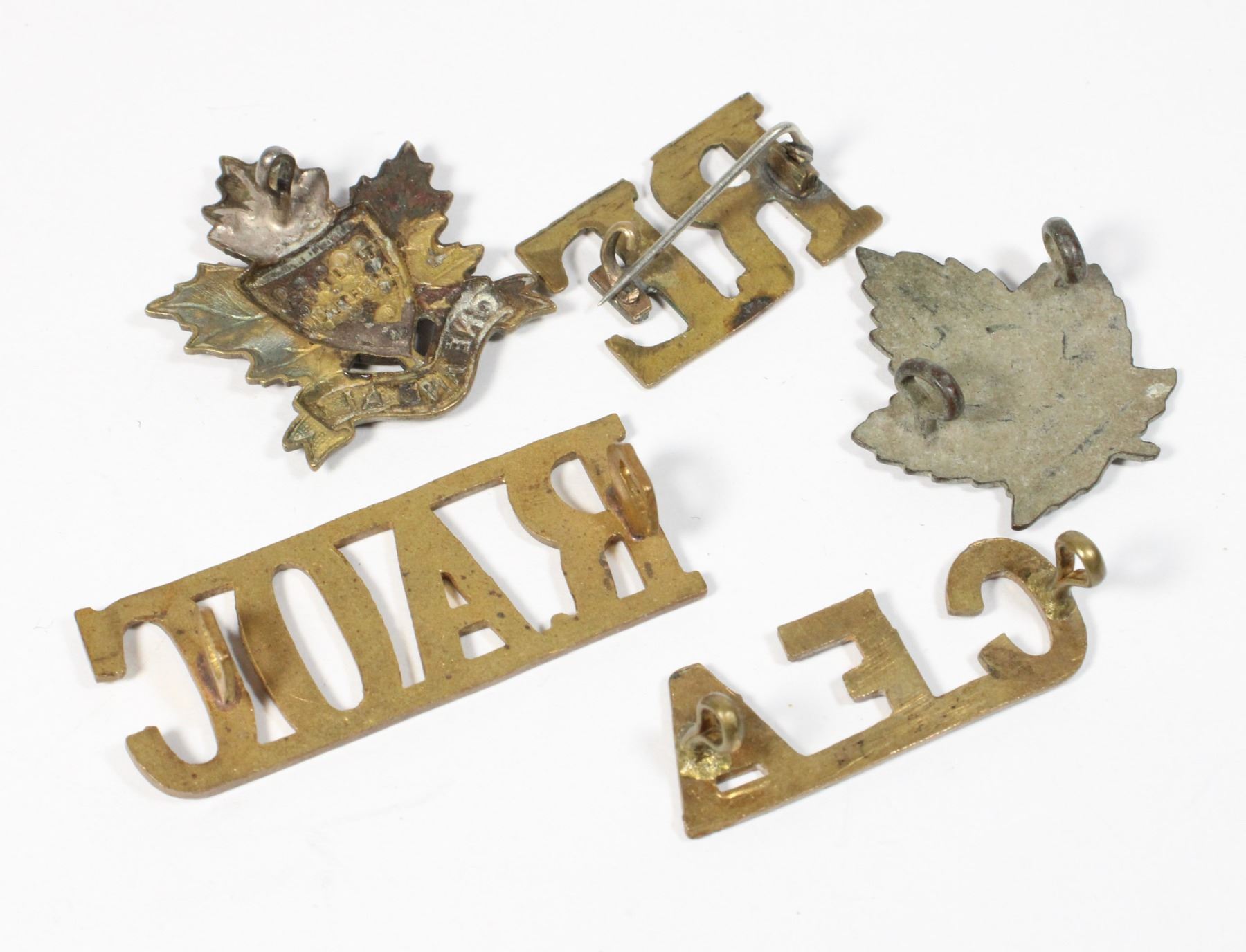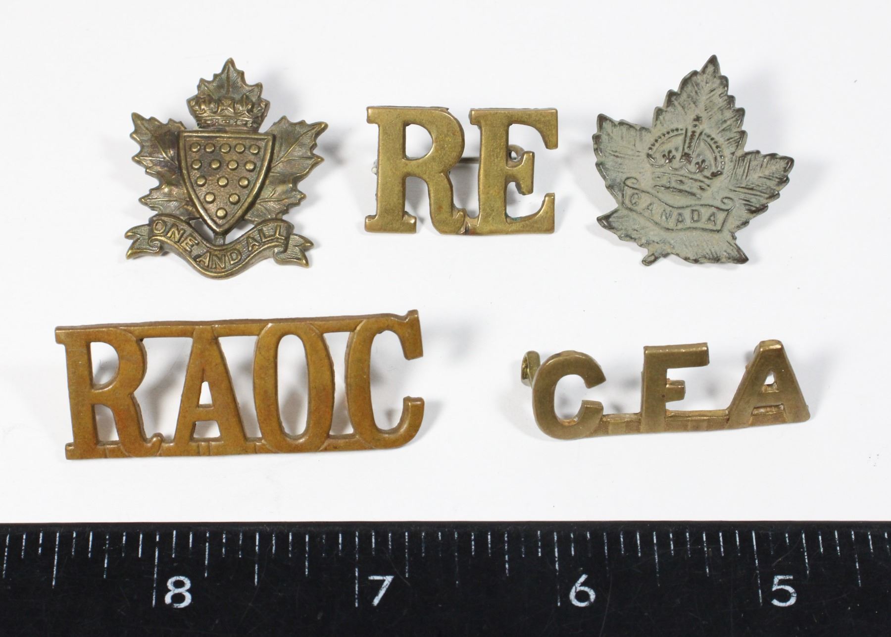 ONE LUG MISSING ON REVERSE POSSIBLY DUKE OF CORNWALL'S OWN RIFLES COLLAR MILITIA PRE WORLD WAR ONE CANADA CANADIAN INSIGNIA SOLD WITH WW1 CANADIAN INSIGNIA LOT CFA + COLLAR BADGE CANADIAN FIELD ARTILLERY AND WORN GENERAL LIST COLLAR BADGE WORLD WAR ONE CEF CANADA CANADIAN ALLIED FORCES, WW1 BRITISH SHOULDER TITLE PAIR RE + RAOC