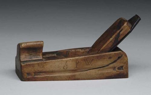 EARLY CARVED WOOD MOLDING PLANE WITH CARVED SILHOUETTE OF FRANKLIN. Small early plane complete with blade and wood holder has a profile cut into the top section, which resembles Benjamin Franklin. An interesting bit of folk art. SIZE: 5-3/4” l. CONDITION: Split to side otherwise good. 9-26913