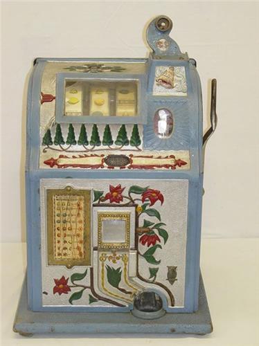 EARLY CAST IRON PAINTED 5 CENT BELL-FRUIT-GUM COIN OPERATED SLOT MACHINE BY MILLS NOVELTY CO., CHICAGO - WORKING, OLD PAINT, BACK LOCK MISSING FROM REAR PANEL, WEAR & IMPERFECTIONS