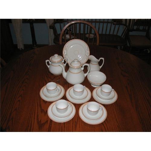 BEAUTIFUL EARLY CHARLES FIELD HAVILAND LIMOGES 20 PIECE TEA/DESSERT SET. THIS IS A LOVELY ANTIQUE LIMOGES TEA SET WITH PEACH AND GOLD TRIM. THE MARK IS CFH MARK #1 IMPRESSED INTIALS ON WHITE WARE WHICH DATES THE SET TO 1868-1881. ALL THE GOLD, WHICH IS REMARKABLY INTRICATE FOR SUCH EARLY PIECES, IS THERE. THERE ARE NO CHIPS CRACKS ETC. EXCEPT FOR A SMALL CHIP/CRACK INSIDE THE TOP OF CREAMER (NOT VISIBLE FROM OUTSIDE) THE TEAPOT IS 8.5" HIGH AND 9" FROM SPOUT TO HANDLE. THE SUGAR BOWL IS 7" HIGH AND 7" HANDLE TO HANDLE. SET ALSO INCLUDES WASTE BOWL AND CAKE PLATE WITH 5 CUPS AND SAUCERS AND 5 DESSERT PLATES. A BEAUTIFUL EXAMPLE OF A WELL PRESERVED VERY EARLY LIMOGES TEA SET!