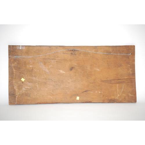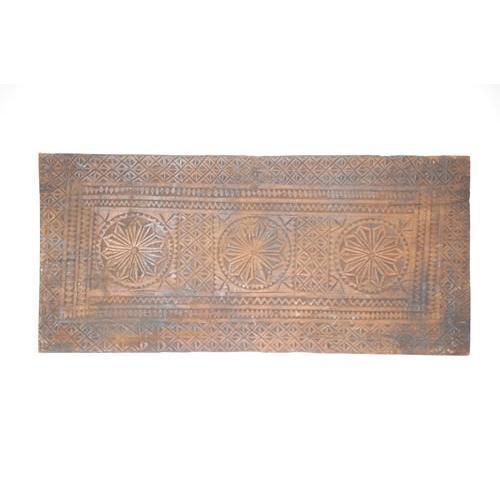 EARLY CHIP CARVED FURNITURE PANEL - LATE 18TH-EARLY 19TH CENT. PINE OHIO OR PA STYLE CHIP CARVED CHEST FRONT PANEL W/ 3 FLORAL CARVED CENTERS & GEOMETRIC BORDERS & SEPARATORS (15.5" X 33.75") - WEAR, REDUCED, REPAIRED, IMPERFECTIONS
