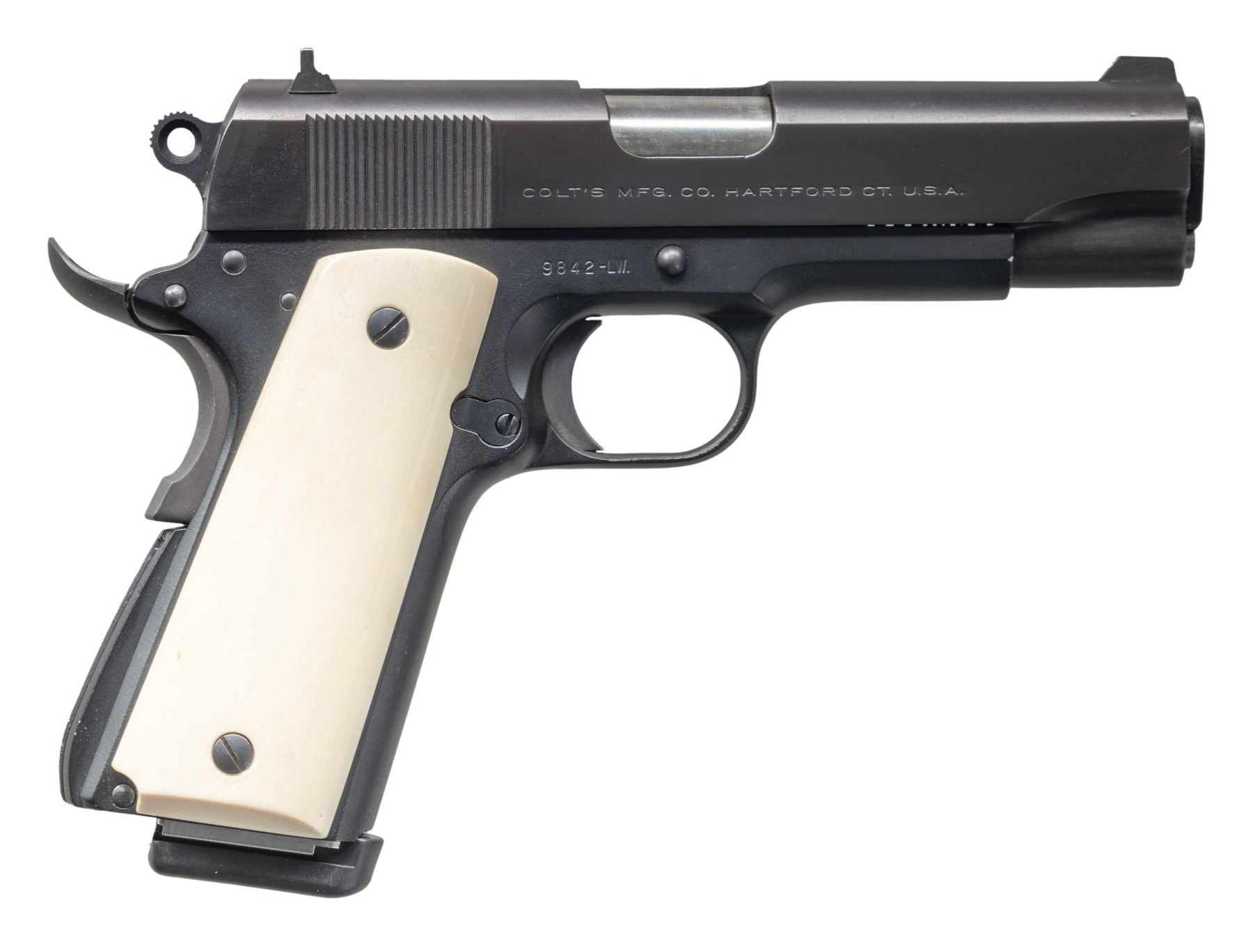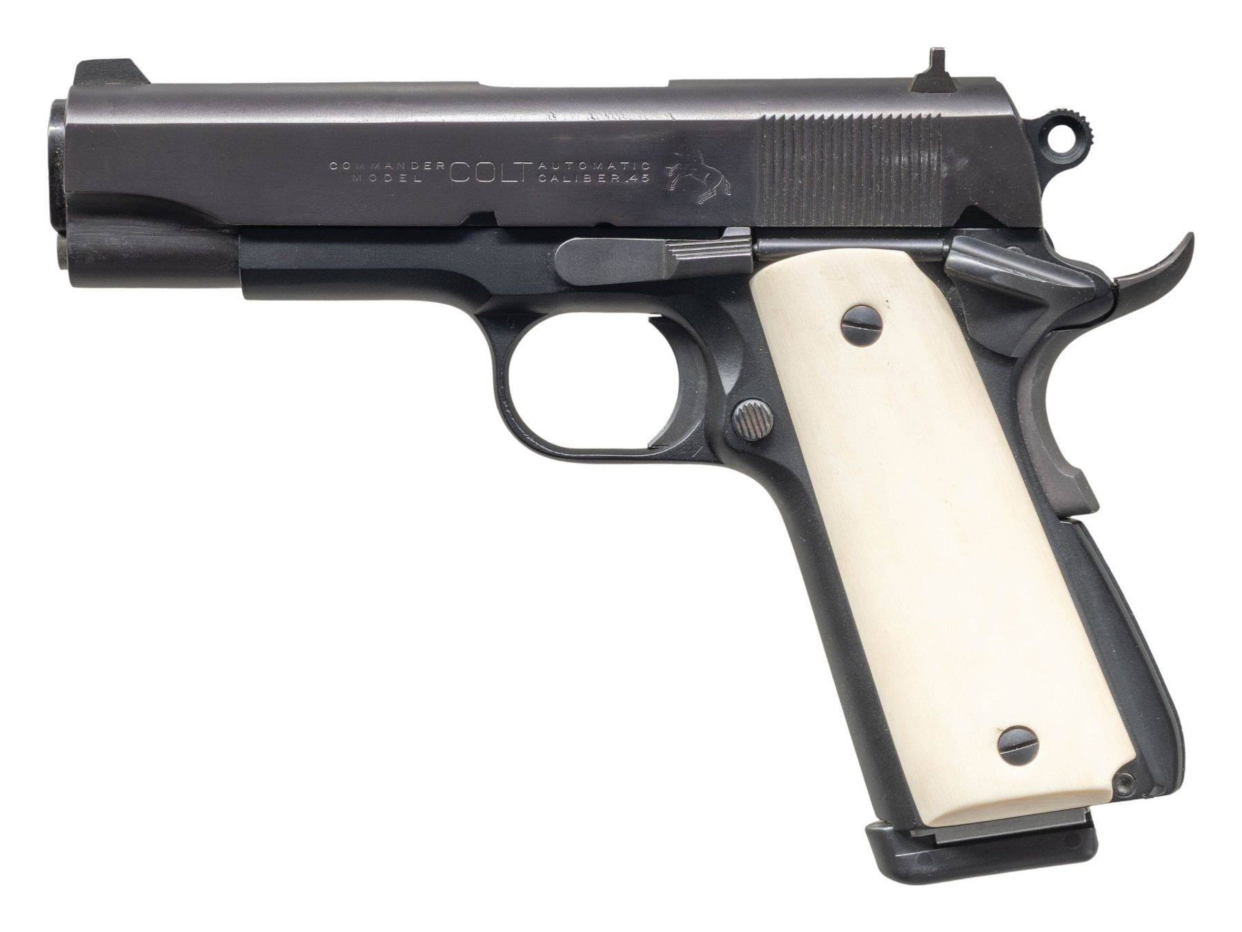 Cal. 45 ACP. S# 9842-LW. Bbl. 4 1/4". Commander Model semi-automatic pistol mfg. by Colt in 1951. Left side of the slide is marked with the model and cal. designations, followed by the Rampant Colt logo, with Colt's single line address marked on the right. Bbl. bushing and recoil spring plug are stamped with an Crown/K within an oval. Alloy frame exhibits a reapplied black enamel type finish, with the slide exhibiting a reapplied blue finish. Bbl. is in-the-white. Frame is mounted with 2-piece smooth natural white grips. Grip safety is an aftermarket replacement. 3-dot iron sights. MAGS: 1 aftermarket Chip McCormick Corp. 8-rd. Power Mag. CONDITION: metal components retain the vast majority of their reapplied finishes, exhibiting a few light superficial handling marks overall. Slide shows some spots of light pitting beneath the bluing. Very bright bore, retaining well defined rifling throughout. Proper manual mechanics. Grips show some light superficial handling marks, but otherwise remain sound. (25-5207/MLW). CURIO. $700-1,000.