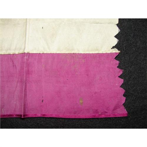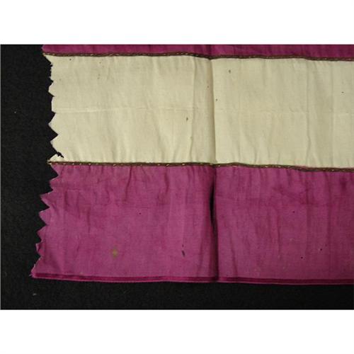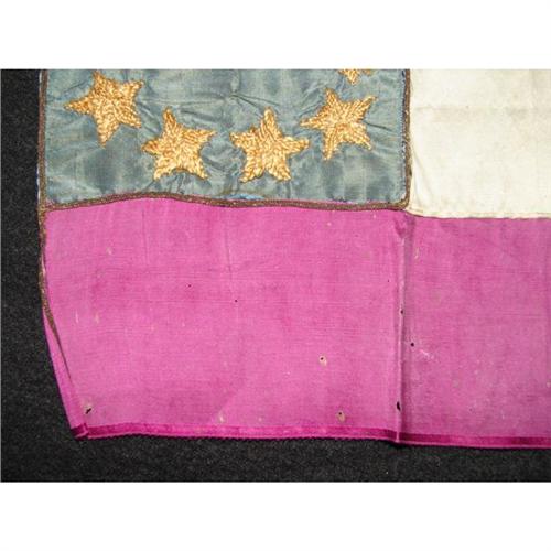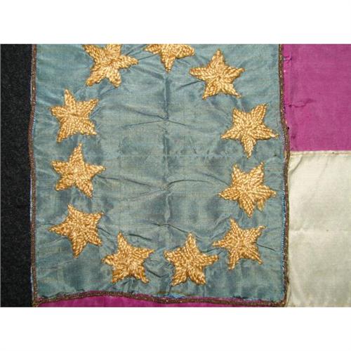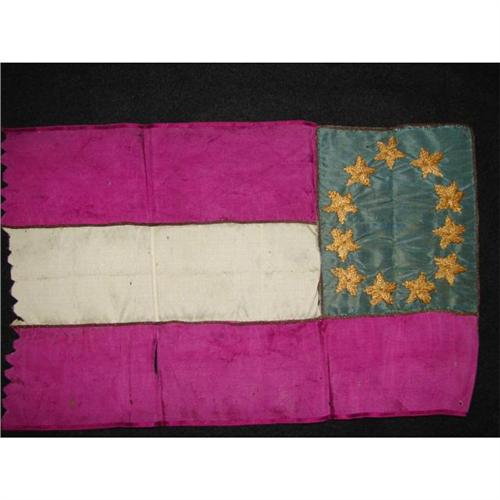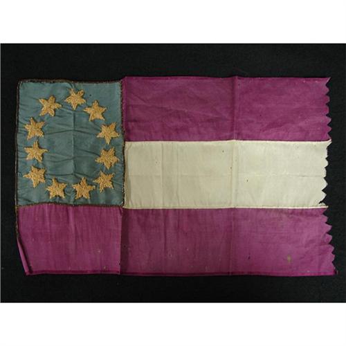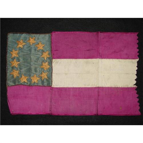 EARLY 11 STAR CONFEDERATE BIBLE FLAG. Hand-stitched first national flag constructed of silk ribbon with 11 sewn stars on both sides of blue canton. Shows some slight tearing at one of two folds. 12” x 7.5”