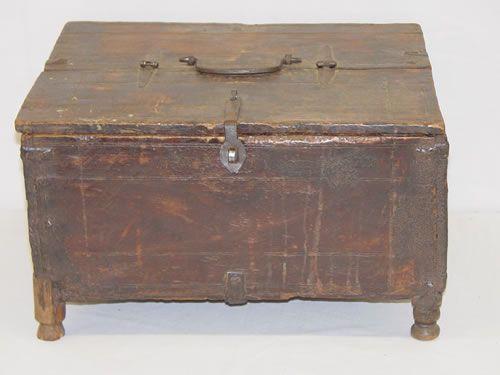 EARLY CONTINENTAL LIFT TOP FOOTED WOODEN TREASURE BOX W/ WROUGHT IRON HARDWARE - OLD FINISH, LOSSES, REPAIRS & IMPERFECTIONS