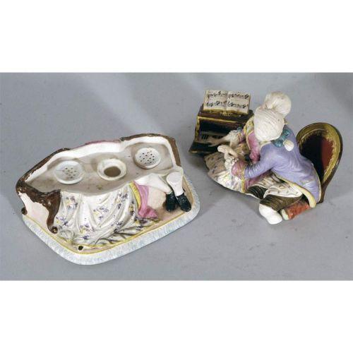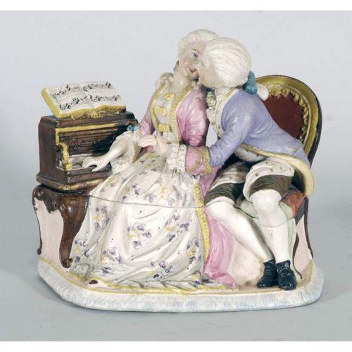 EARLY CREAMWARE INK STAND in the form of a courting couple with ink pot and shakers, her head broken and glued CONDITION REPORT: substantial restoration. PACKING AND SHIPPING: We offer packing (double boxed in most cases) and shipping of this item within the Continental United States by USPS or UPS (our choice- boxes over 30lbs or oversized may be recalculated based on buyer's location), NOT INCLUDING INSURANCE (it will be added when we know the sales price) for $25