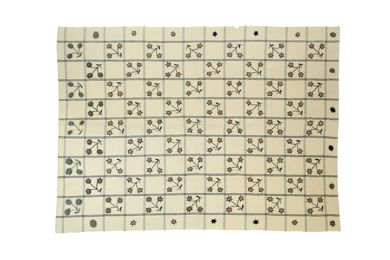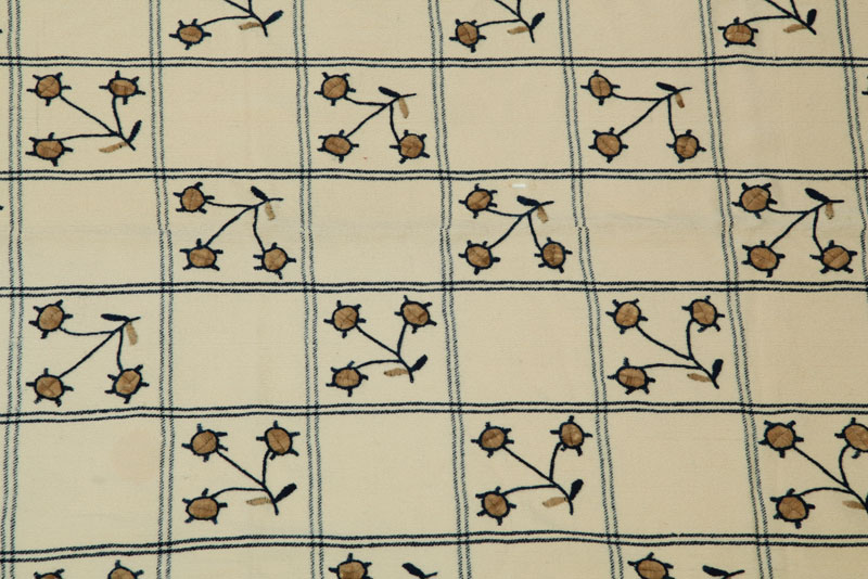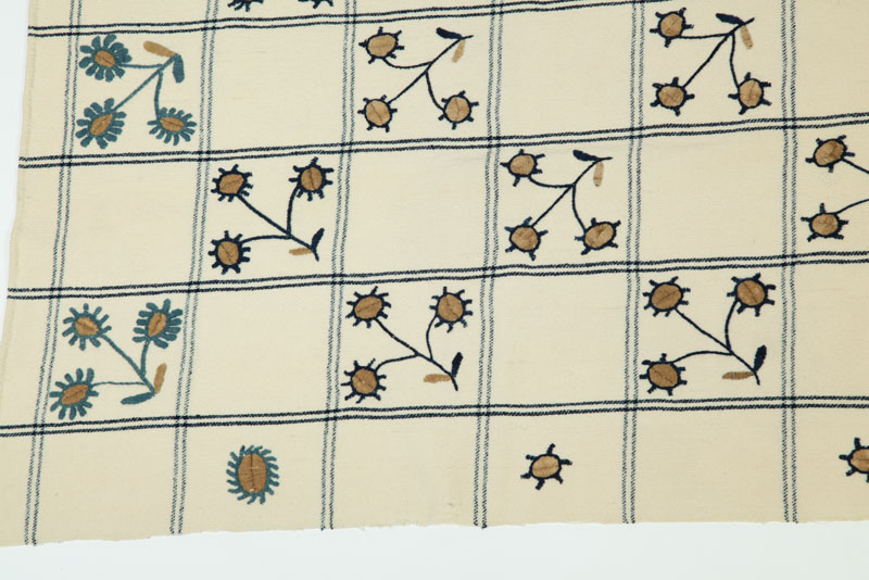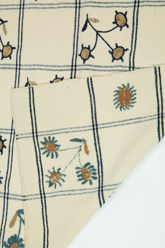 Probably upstate New York, 1st half-19th century, wool. Center seam handwoven twill blanket in blue and natural windowpane with embroidered flowers in blue and gold. 60" x 82".