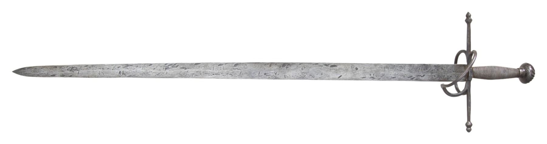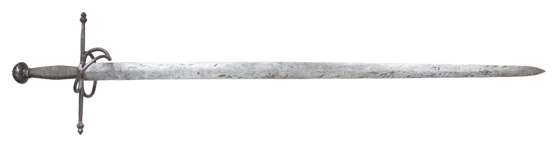 A good example of an early English broadsword from the 16th century measuring 44" overall with a 38 1/4" double edged blade. The blade has a slightly raised medial ridge a heavy armorer's mark on one side. The crossguard is 10 1/4" across and there is a single ring and a single loop guard. Large mushroom style pommel with swirled lineal design. Full wire wrapped grip with no end pieces. CONDITION: The entire sword has a medium gray patina with some minor variation. PROVENANCE: Estate Collection of Nicholas Apergis. (02-24690/BF). $2000-3000.