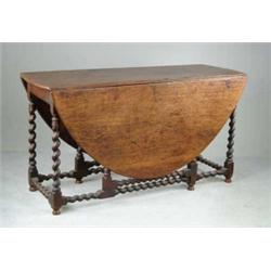 Lot # 661 EARLY ENGLISH OAK SPIRAL CARVED GATELEG TABLE. 17th Century large dining table has spiral carved and blocked legs and stretchers. Deep semi-circular leaves supported by a pullout leg support. Oval form when fully extended having nice patina and quartered oak type top. SIZE: 28-3/4” h x 53” d x 63” w (open); 18” (closed). CONDITION: Generally very good with some minor repairs. Early replaced feet. 9-96414 (4,000-6,000)