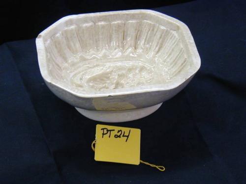EARLY ENGLISH PUDDING DISH, INTERIOR HAS GRAPE LEAF PATTERN, SEVERAL SMALL FLICKS ON EDGES