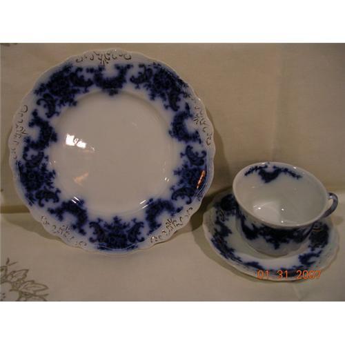 Early Flow Blue NELSON Plate, Cup, and Saucer Set. Deep blue color. Excellent condition--very hard to find a set of 3. New Wharf, circa 1890's. Blue marks underneath each piece. The dinner plate measures 9 inches. The cup measures 4 inches across and 2 3/4 inches high. The saucer measures 6 inches across. This auction is for 1 place setting of the 3 pieces. We have 5 more of these place settings (plate, cup, saucer) available. We carefully pack and double box our fine porcelain and glass items.